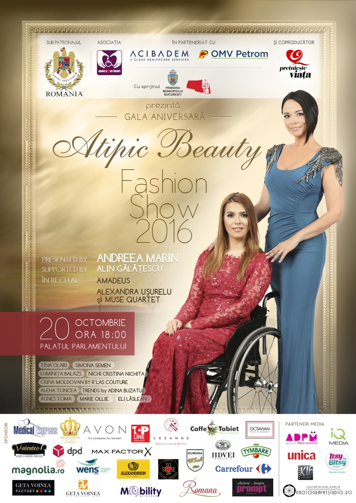 Gala Aniversara Atipic Beauty 2016 Supported by Alin Galatescu, e un eveniment de amploare in care umanitatea, generozitatea si frumusetea se impletesc si au construit o traditie. Gala transmite un mesaj puternic: frumusetea e in noi, nu in aparente! Anul acesta, Fundatia Pretuieste Viata (coproducator) isi da mana cu Asociatia Open Your Heart (initiator), sub patronajul Camerei Deputatilor, cu sprijinul Primariei Municipiului Bucuresti si ARCUB, avand drept parteneri principali doua companii puternic ancorate in proiectele sociale din Romania: Acibadem Hospitals Group si OMV Petrom.