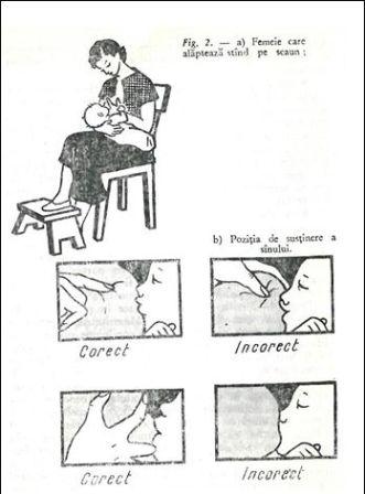 Copilul va fi luat in brate, cu capul sprijinit si usor ridicat pe unghiul pe care-1 formeaza bratul si antebratul mamei de partea sanului pe care i-1 ofera, in asa fel incat gura copilului sa ajunga in dreptul mamelonului. Trunchiul copilului va fi sustinut in poala mamei.