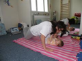 - culcat pe spate cu genunchii indoiti si gambele ridicate la 90 de grade, asezati copilul cu burtica pe gambele d-voastra. Intindeti usor picioarele la 45-60 de grade si reveniti. Tot timpul tineti copilul de manute.