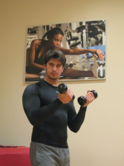 Pentru bicepsi, foloseste bara de 3 kg; se porneste cu bratul din extensie, executand flexia bicepsului pana la un unghi de 90˚ intre antebrat si biceps (30 repetari x 4 serii). Continuam exercitiul pentru biceps, de aceasta data lucrand de la jumatate in sus, ridicare catre barbie (30 repetari x 4 serii). Se termina exercitiul cu o miscare completa de lucrare a bicepsului, sus-jos (20 repetari x 4 serii). Vom avea pauze de 40 de secunde intre seturi, in cazul fiecarui exercitiu.