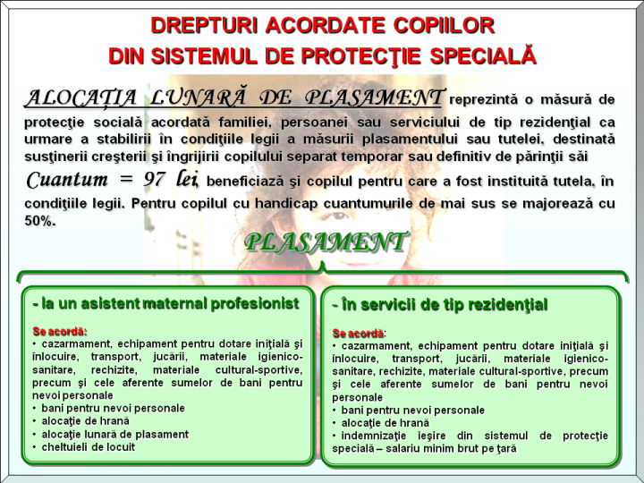 Buna, am 17 ani si am un baiat de 26 de luni care e in plasament la mama mea deoarece eu sunt inca eleva , el beneficiaza de acea alocatie de plasament dar observ ca sunt si alte beneficii (ex:cazarmament,transport,jucarii) cum pot sa beneficiez de acesta?